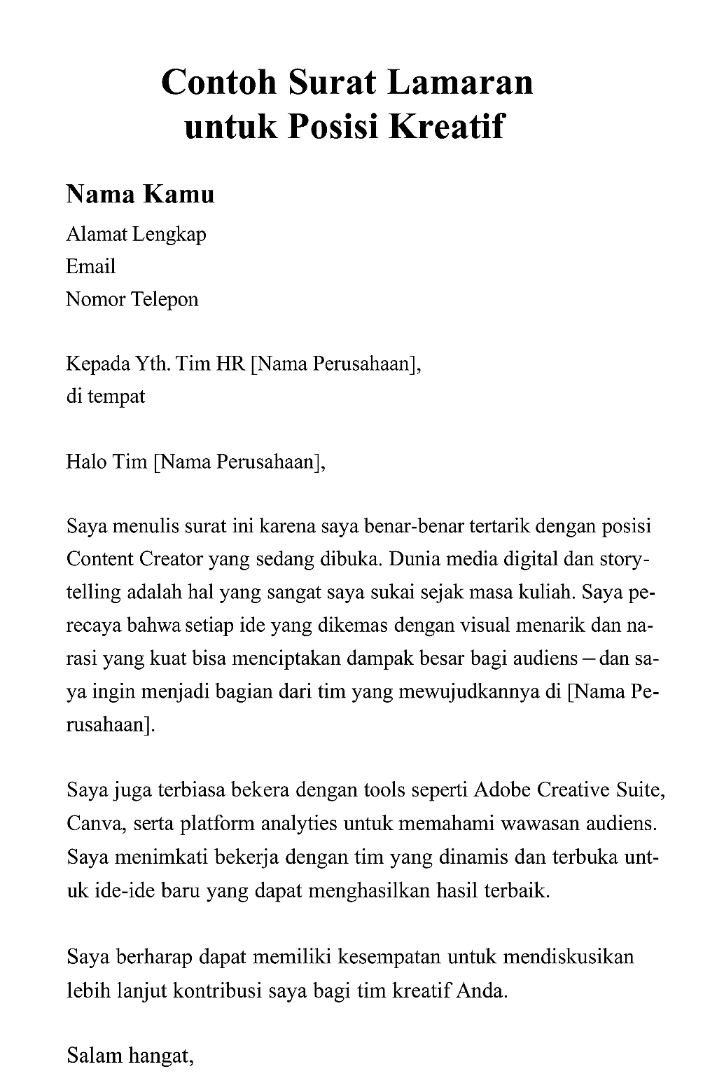 Contoh Surat Lamaran untuk Posisi Kreatif