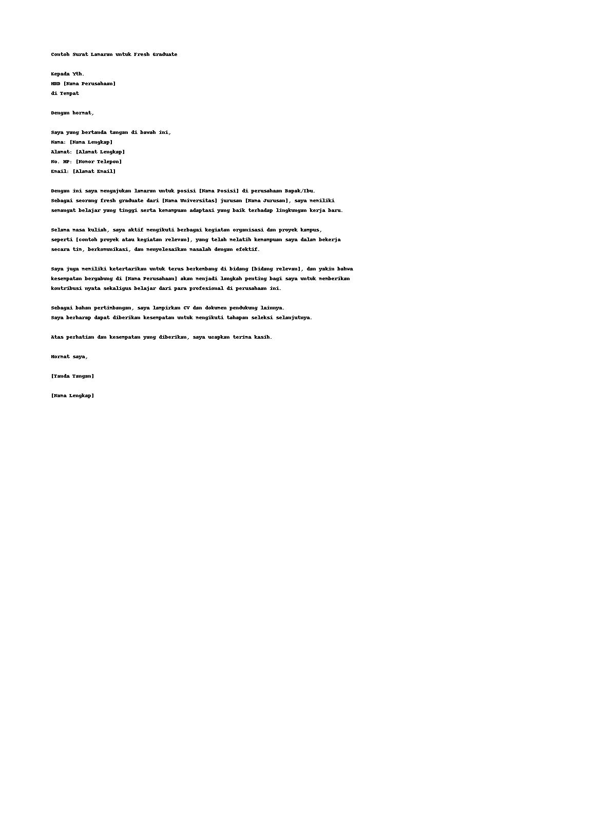 Fokuskan surat pada semangat belajar, kemampuan adaptasi, dan potensi diri. Jelaskan kegiatan kampus atau proyek pribadi yang relevan dengan posisi yang dilamar.