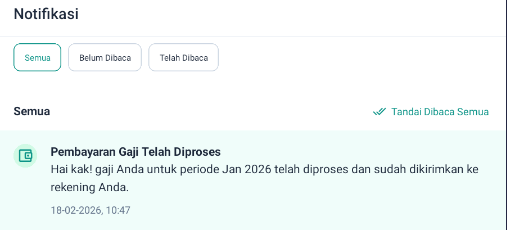 Setelah proses transfer gaji selesai, karyawan akan menerima notifikasi pada aplikasi Kerjoo bahwa gaji telah dibayarkan.