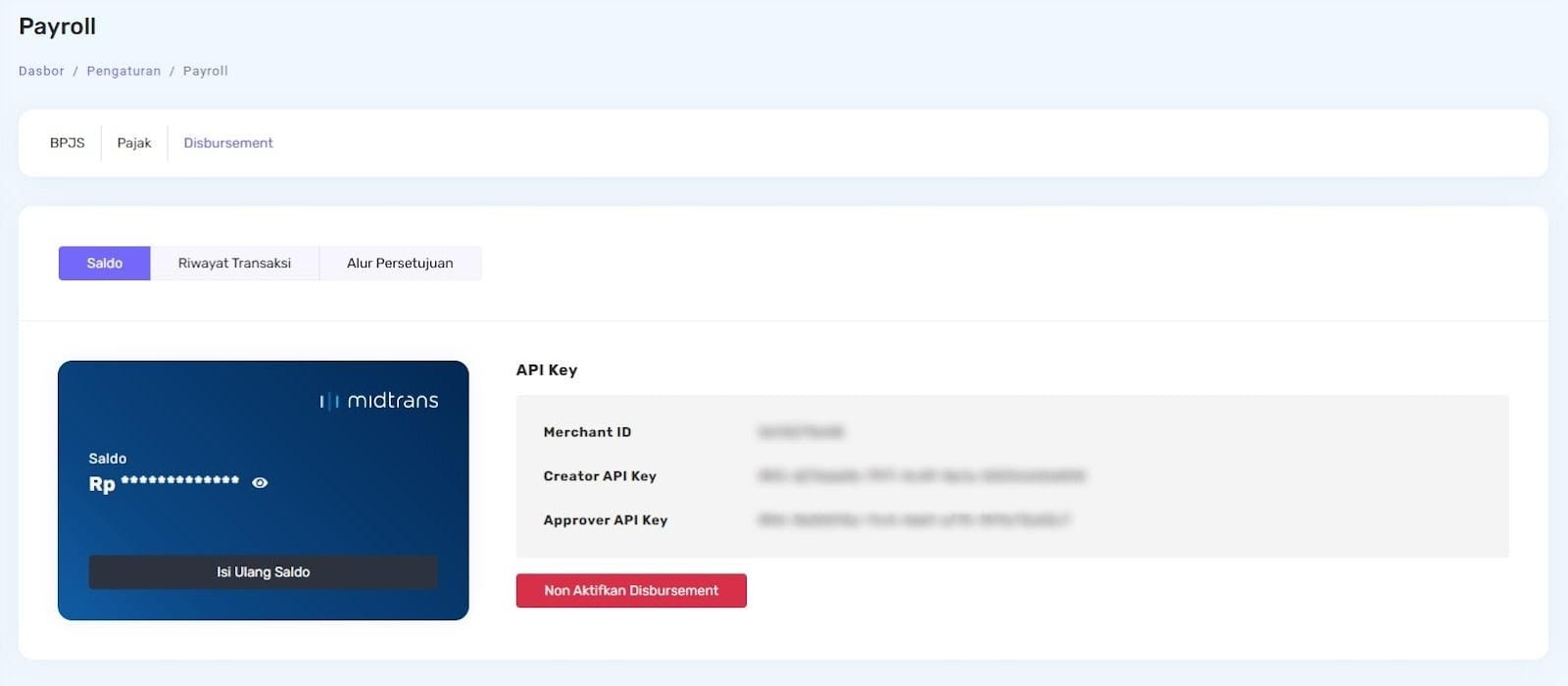 Jika konfigurasi berhasil, fitur Disbursement akan aktif dan siap digunakan.