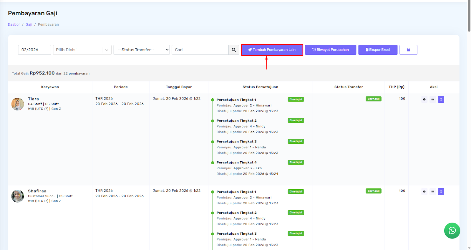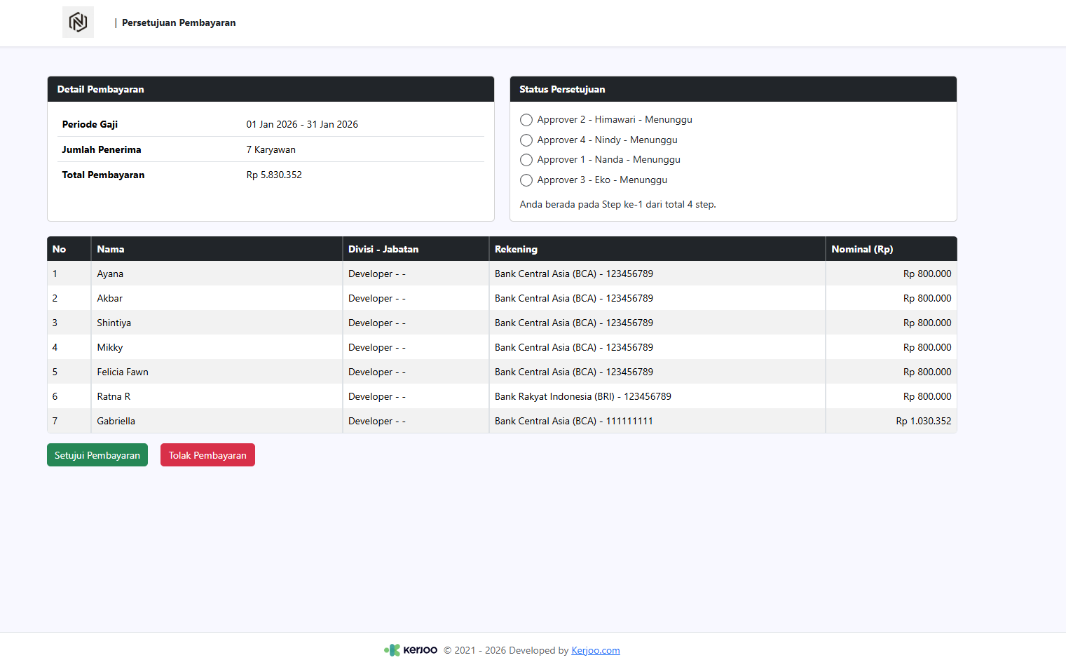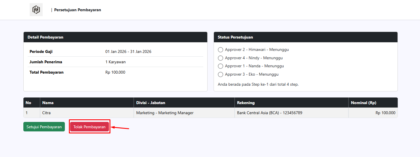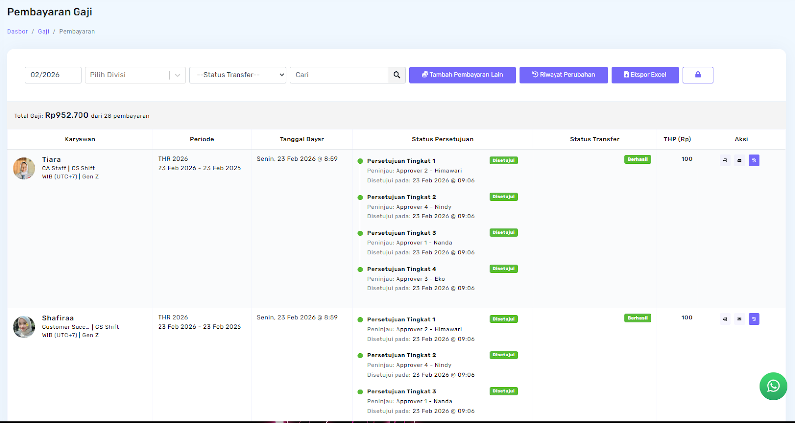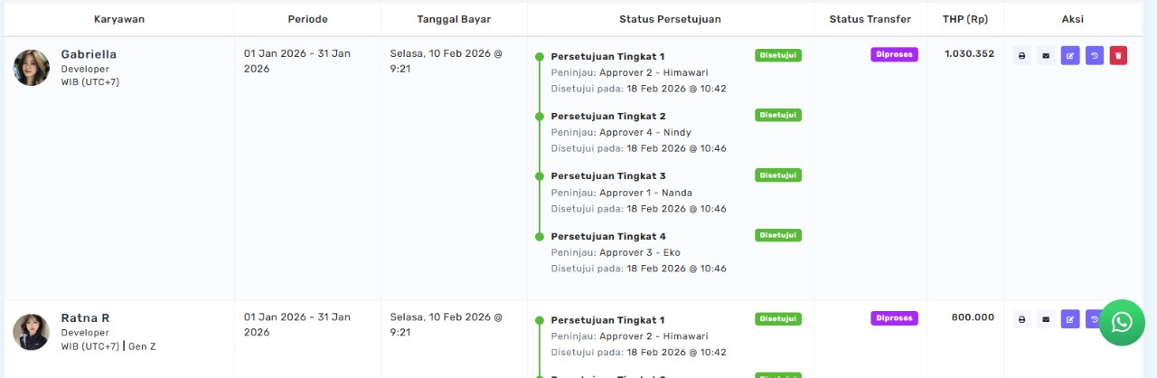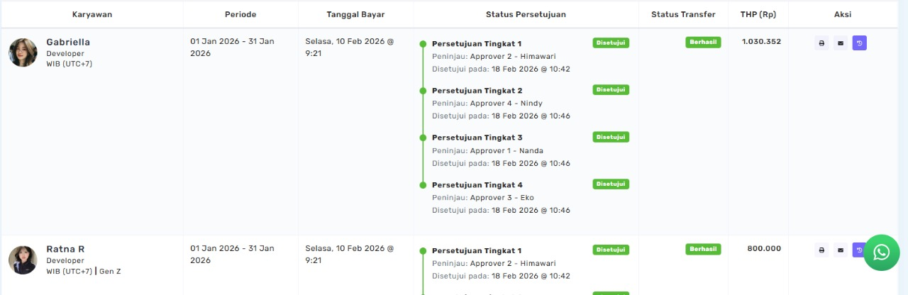 Pada halaman Pembayaran Gaji, status approval akan diperbarui dan persetujuan dari approver pertama akan ditampilkan sebagai Disetujui.