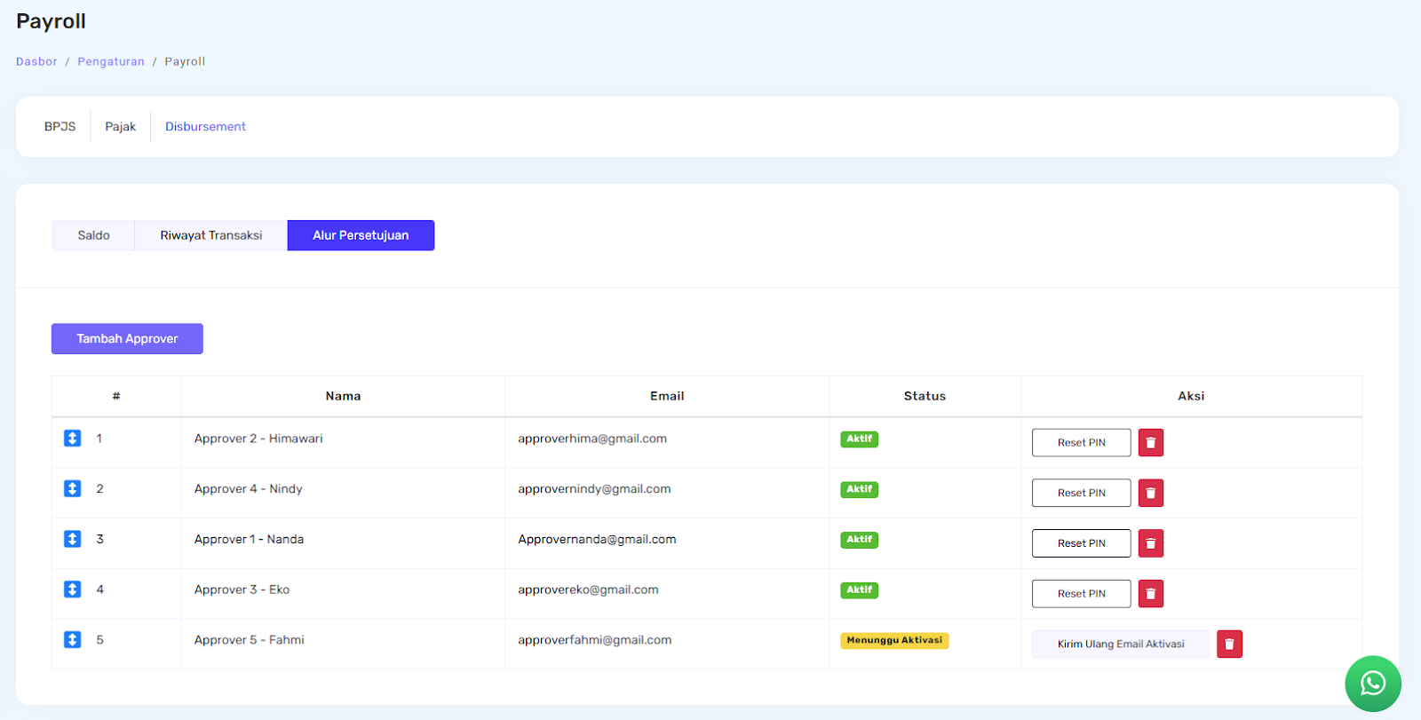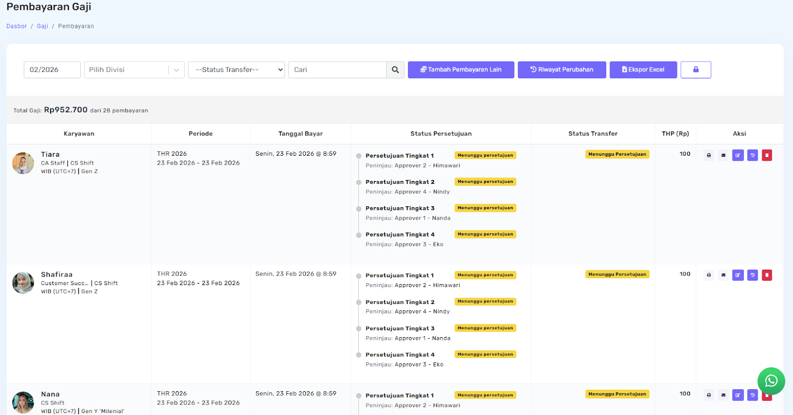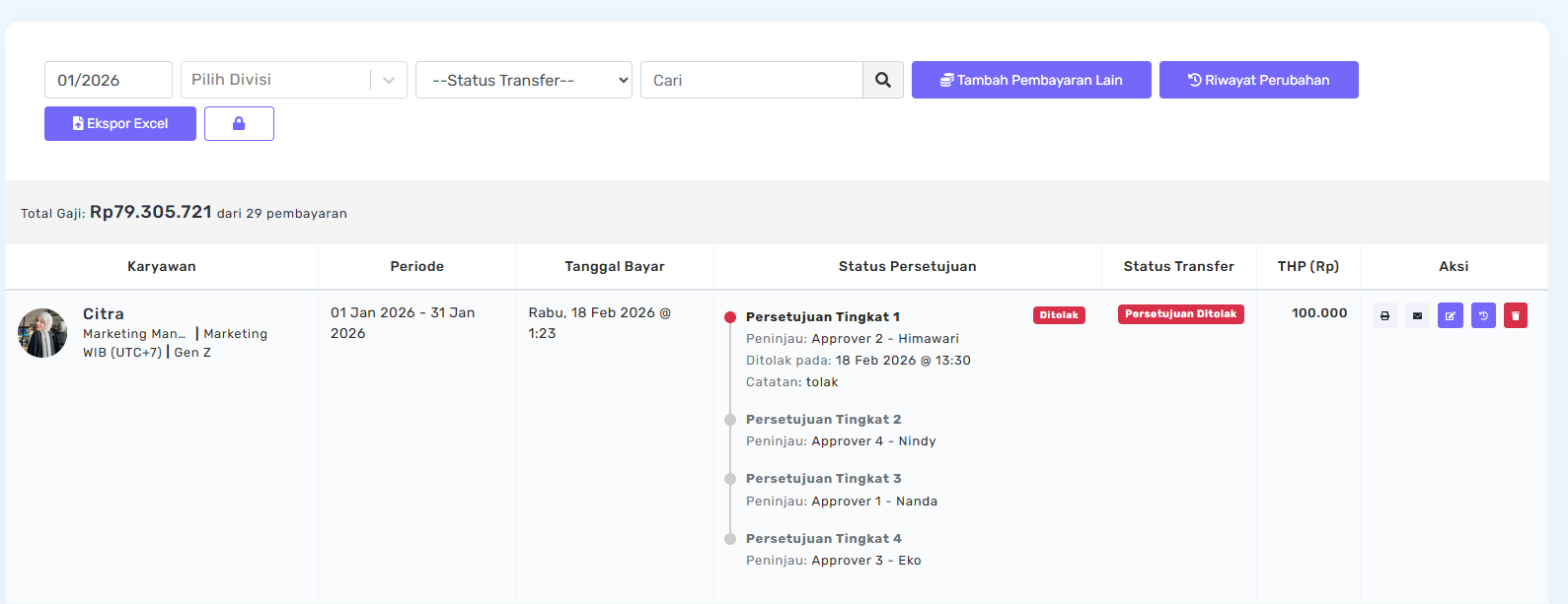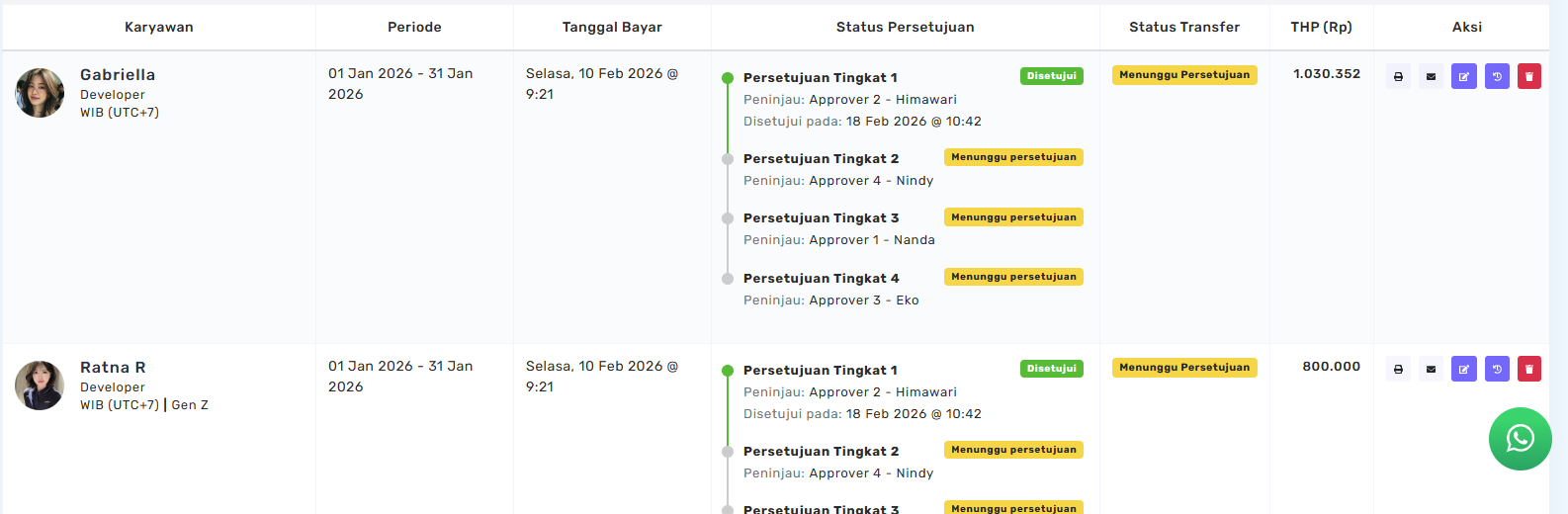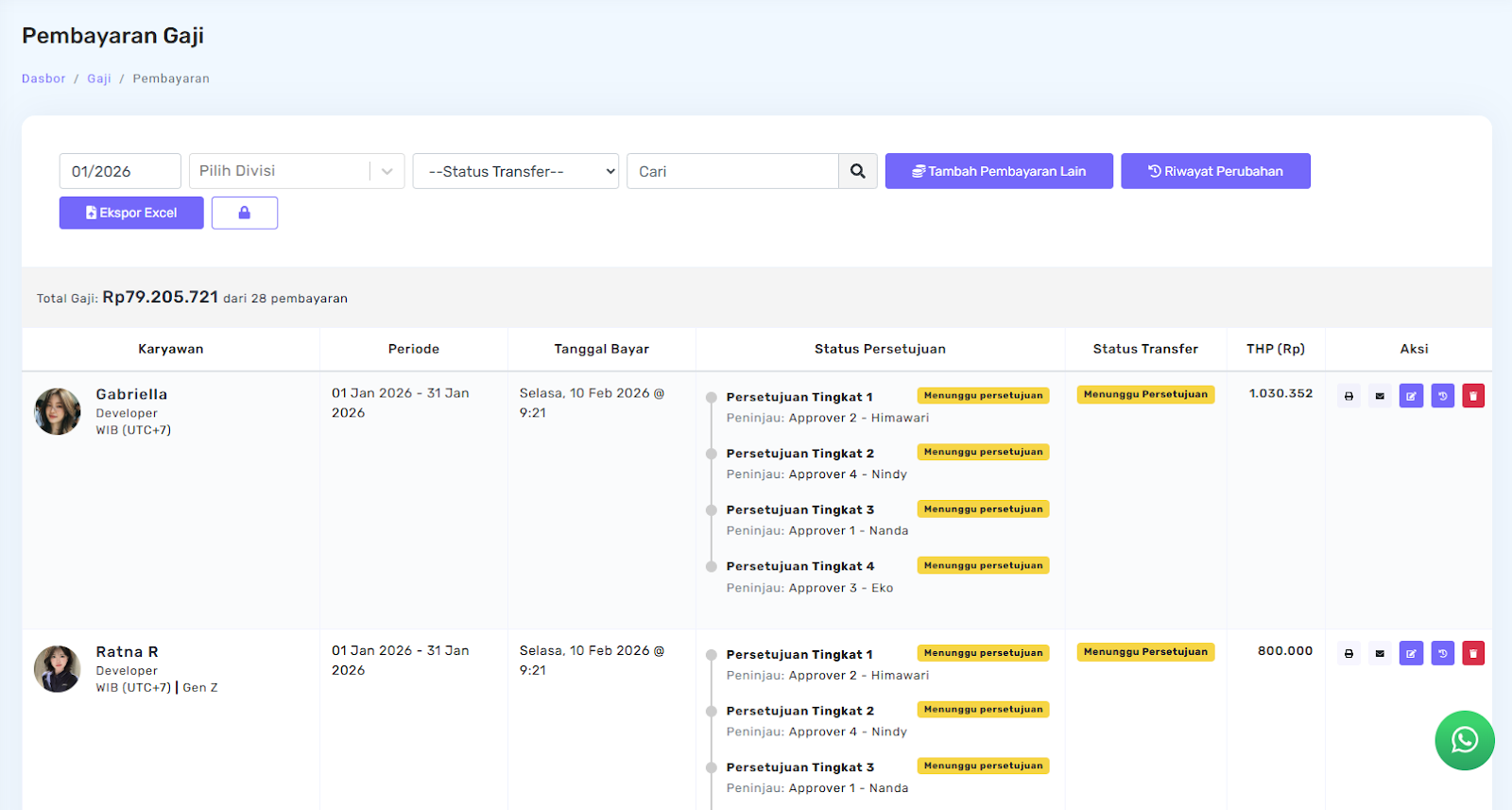 Pada halaman Pembayaran Gaji, status approval akan diperbarui dan persetujuan dari approver pertama akan ditampilkan sebagai Disetujui.