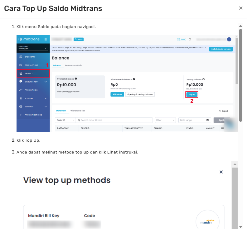 Perusahaan perlu melakukan top up saldo langsung ke akun Midtrans atau Nicepay masing-masing. Untuk mempermudah, tersedia tombol Isi Ulang Saldo yang mengarahkan ke panduan pengisian saldo.
