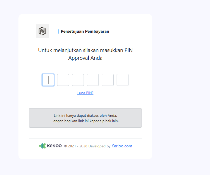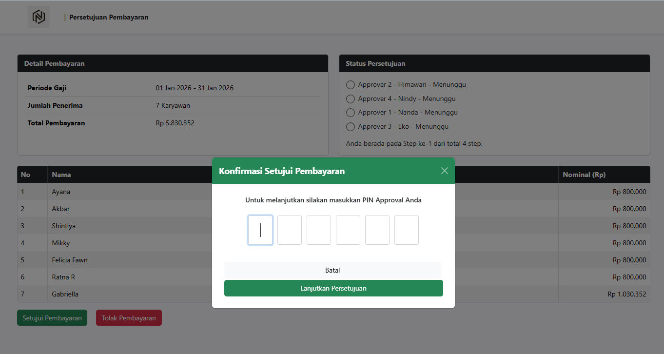 Untuk menyetujui pembayaran, approver pertama diminta memasukkan PIN Approval, kemudian klik Lanjutkan Persetujuan.