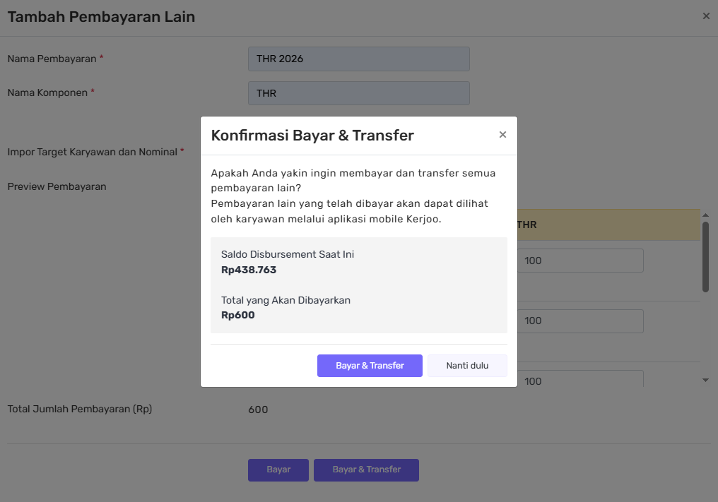 Fitur Disbursement merupakan solusi pembayaran gaji dari Kerjoo yang terintegrasi langsung dengan layanan pihak ketiga, yaitu Midtrans dan Nicepay . Artinya, setelah proses hitung gaji selesai, perusahaan tidak perlu lagi berpindah platform atau melakukan transfer manual satu per satu melalui internet banking.