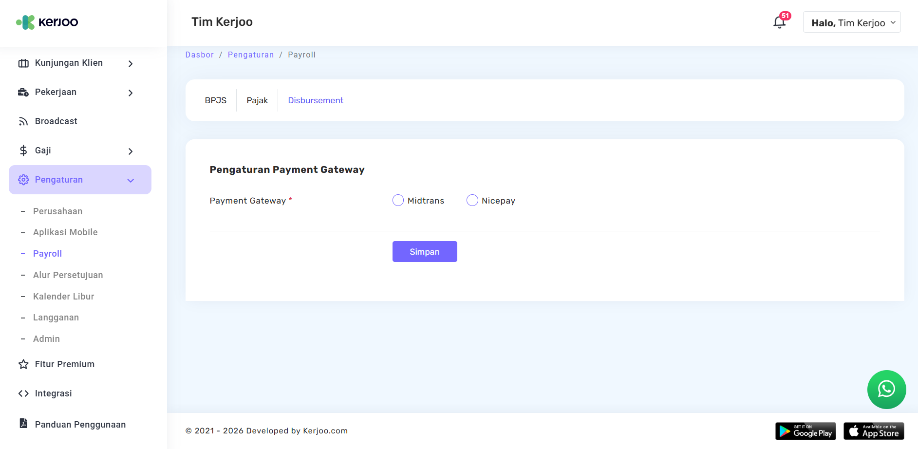 Tim Kerjoo akan membantu perusahaan membuat akun Disbursement di Midtrans atau Nicepay terlebih dahulu.