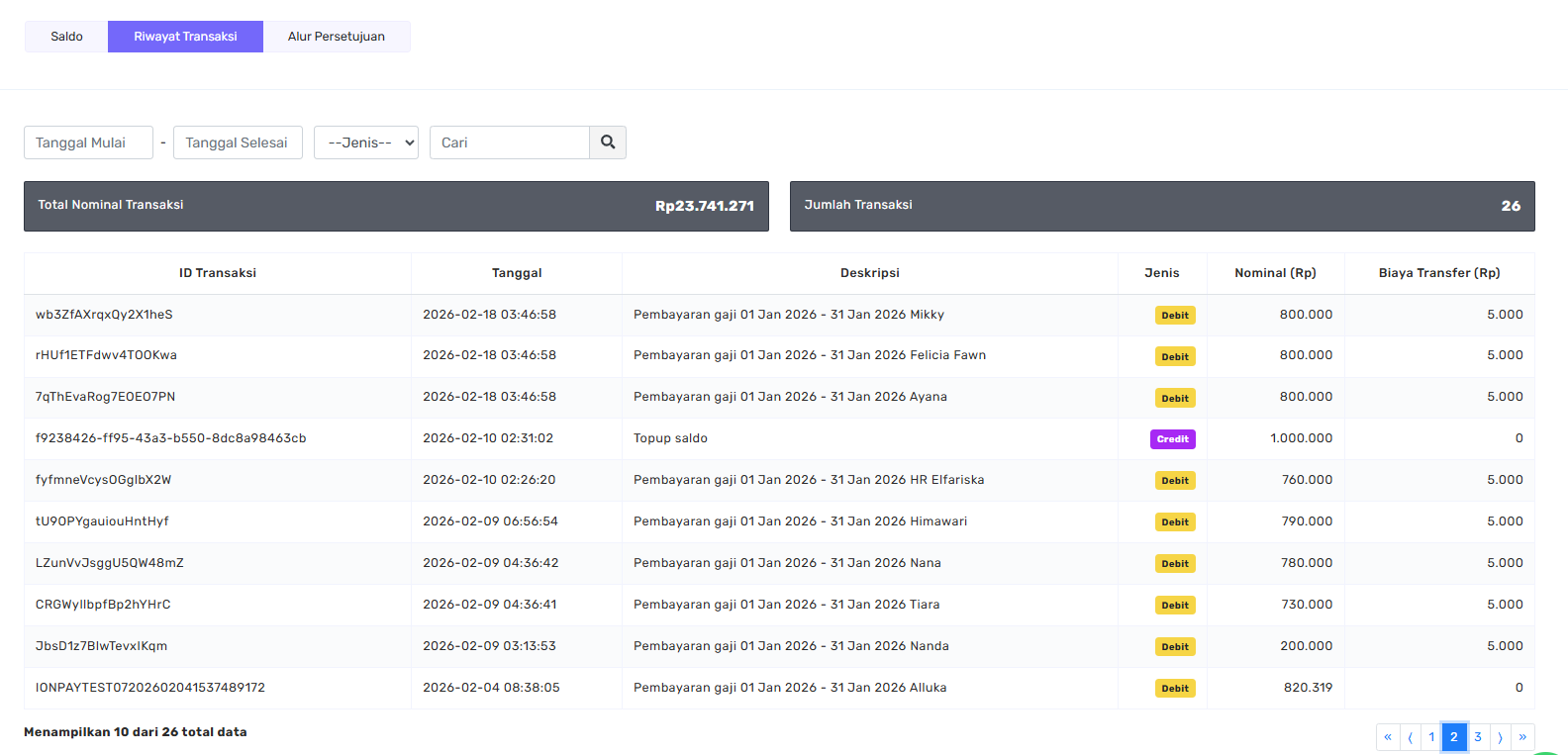 Setelah pembayaran gaji selesai dilakukan, admin dapat melihat riwayat transaksi disbursement pada tab Riwayat Transaksi.
