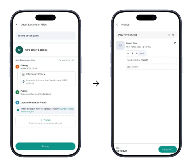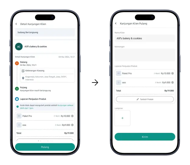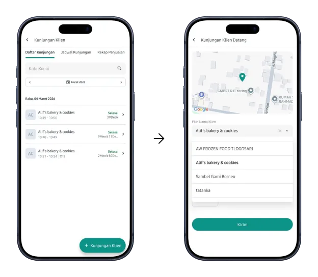 Fitur Kunjungan Klien di aplikasi memungkinkan karyawan melakukan pencatatan kunjungan sekaligus melakukan penjualan langsung di tempat tanpa perlu sistem terpisah.