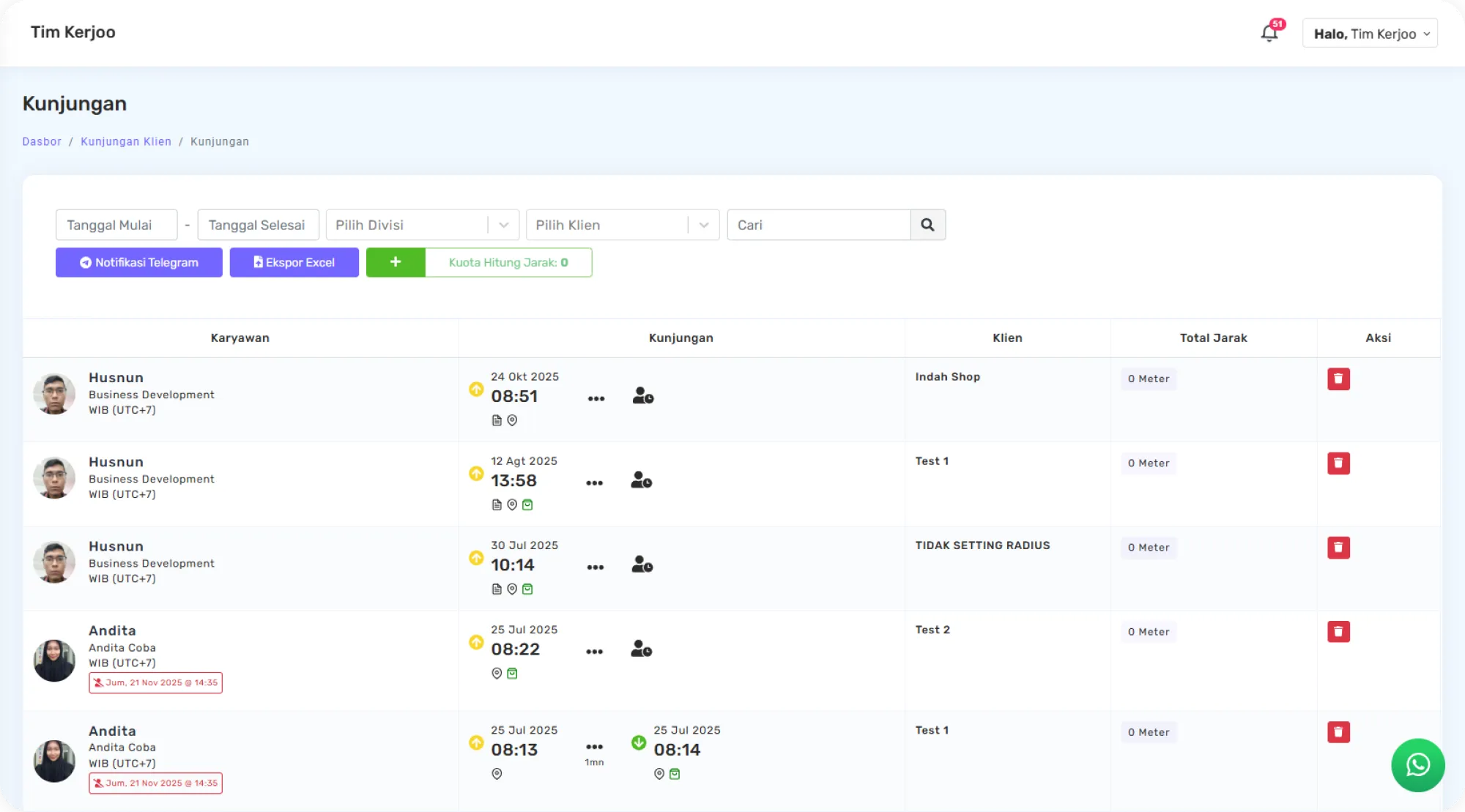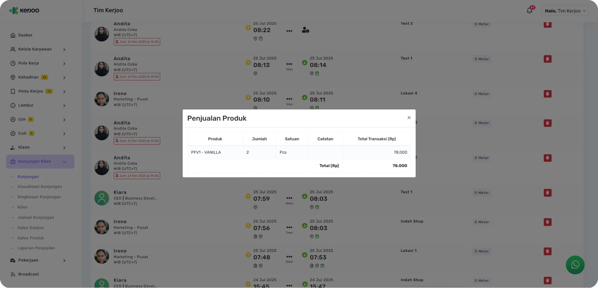 Fitur Kunjungan Klien Penjualan Langsung di Kerjoo menjawab semua itu dalam satu sistem terintegrasi.