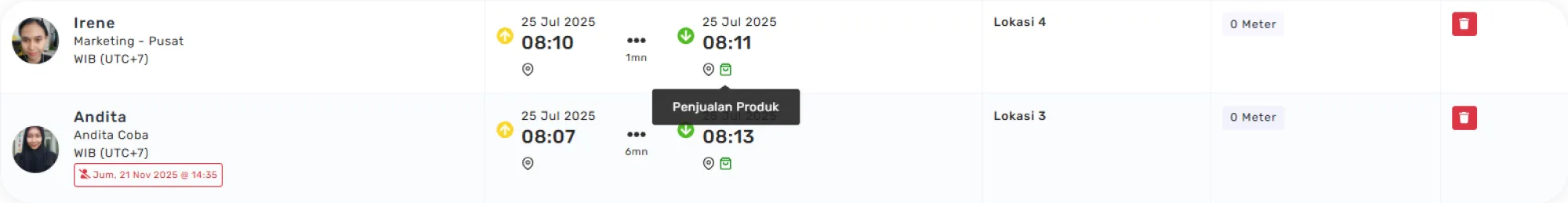 Di sana admin dapat melihat karyawan yang melakukan kunjungan berikut dengan detail tanggal, jam, lokasi, dan penjualan produknya.