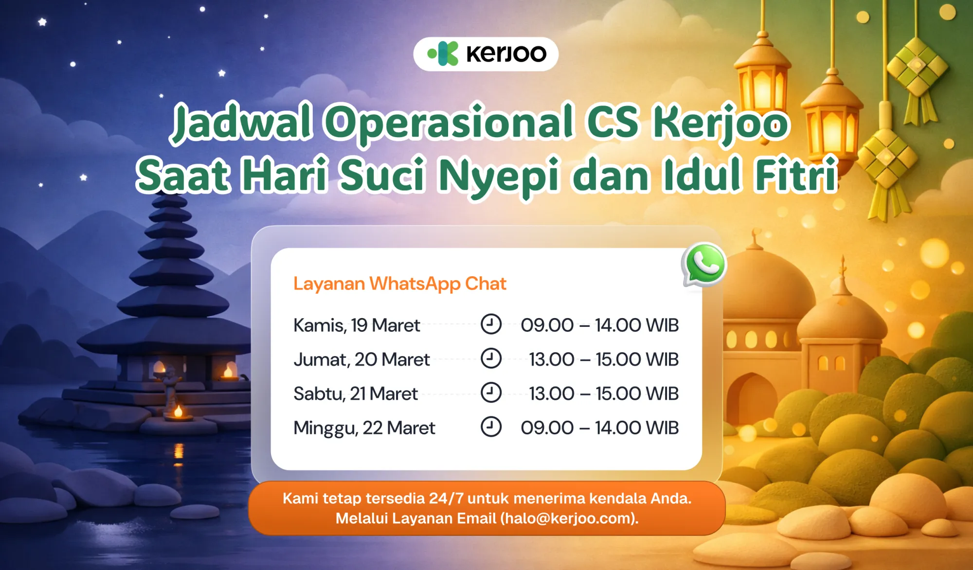 Sehubungan dengan perayaan hari raya, layanan Kerjoo akan mengalami penyesuaian operasional selama periode libur Lebaran. Agar libur Anda tetap tenang dan kebutuhan operasional perusahaan tetap berjalan dengan baik, tim Kerjoo tetap siaga membantu melalui jadwal berikut.